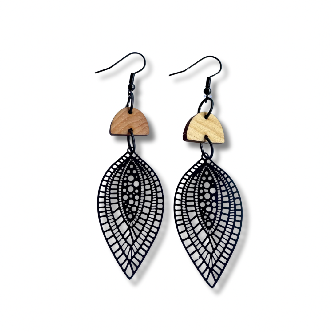 Diese Ohrringe im Boho Style bestehen aus heimischem Zirbenholz und schwarz lackiertem Edelstahl. Das Design stellt absolute Natürlichkeit dar und bietet federleichten Tragekomfort.