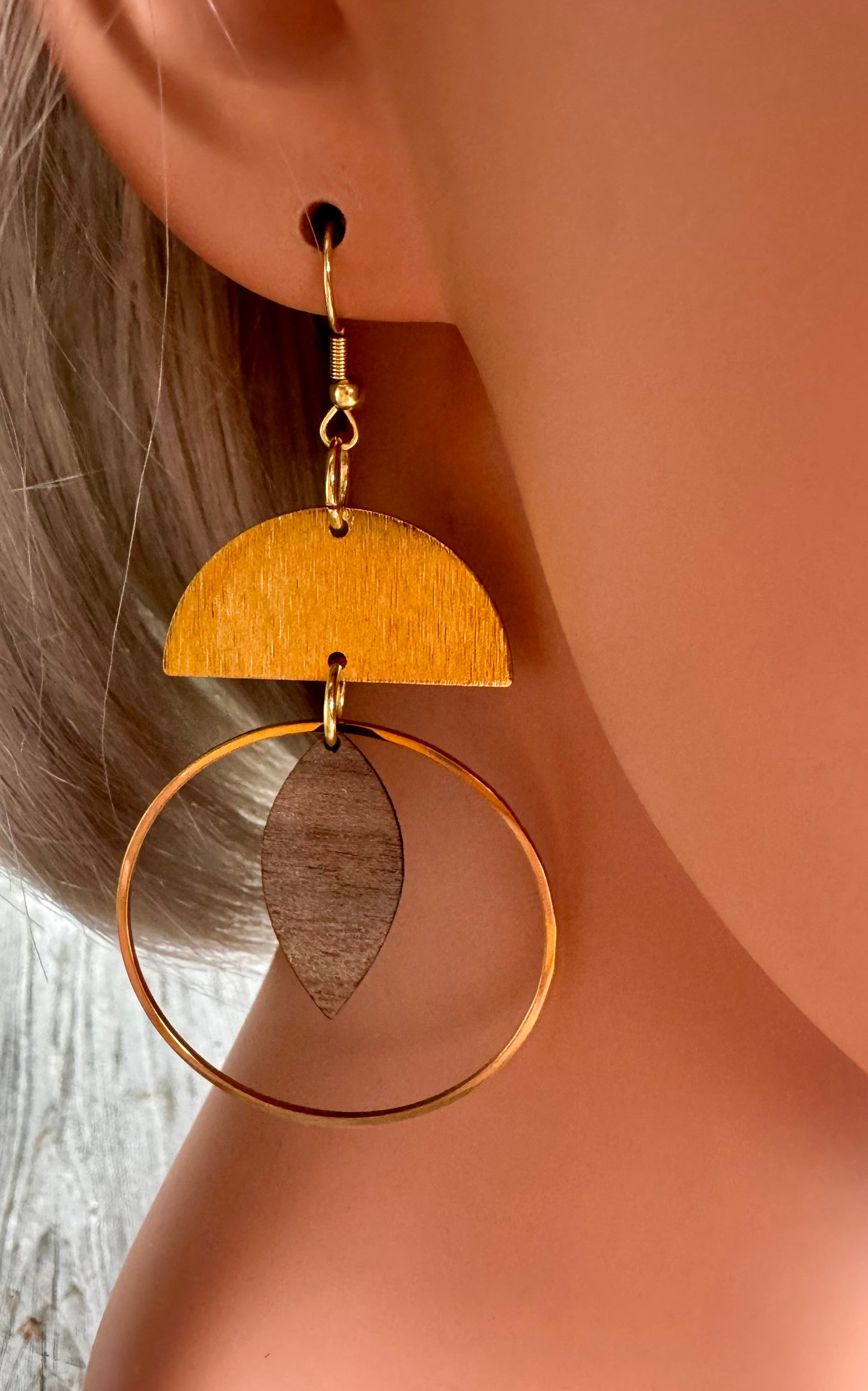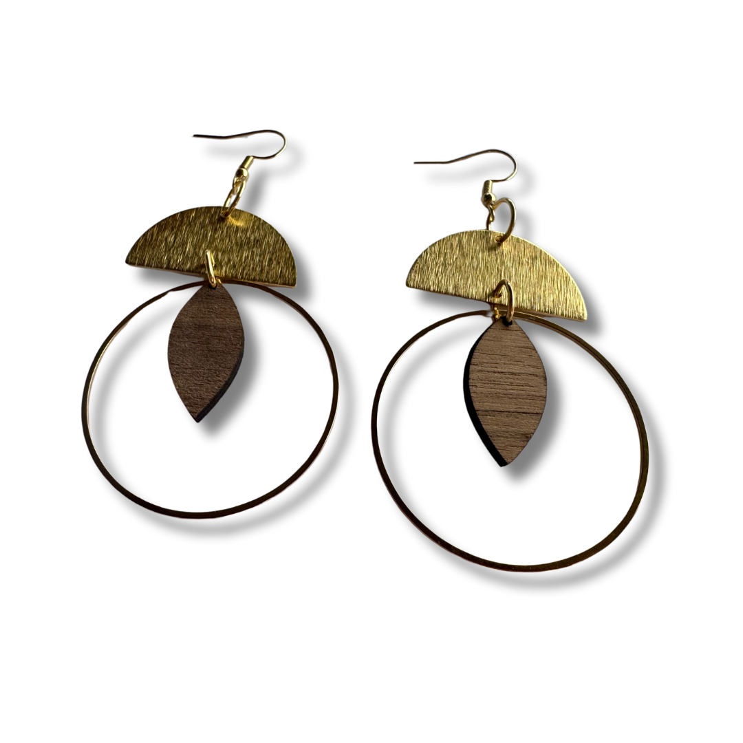 Diese Ohrringe im Boho Style bestehen aus heimischem Nussholz und vergoldetem Edelstahl. Das Design stellt absolute Natürlichkeit dar. Die Ohrhänger bieten federleichten Tragekomfort.
