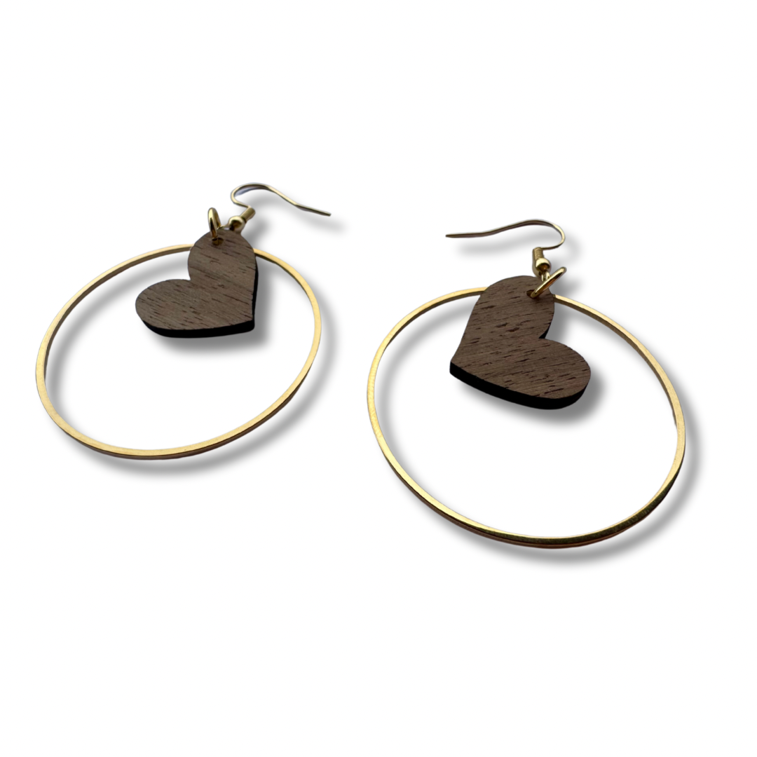 Ohrringe mit einem Herzen aus heimischem Nussholz. Die Hänger und der Ring sind aus vergoldetem Edelstahl. Das Design stellt absolute Natürlichkeit dar. Die Ohrhänger bieten federleichten Tragekomfort.
