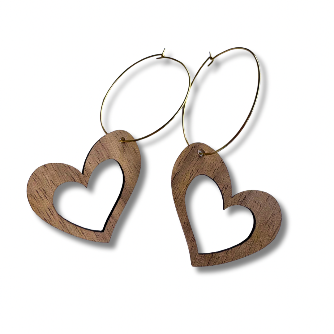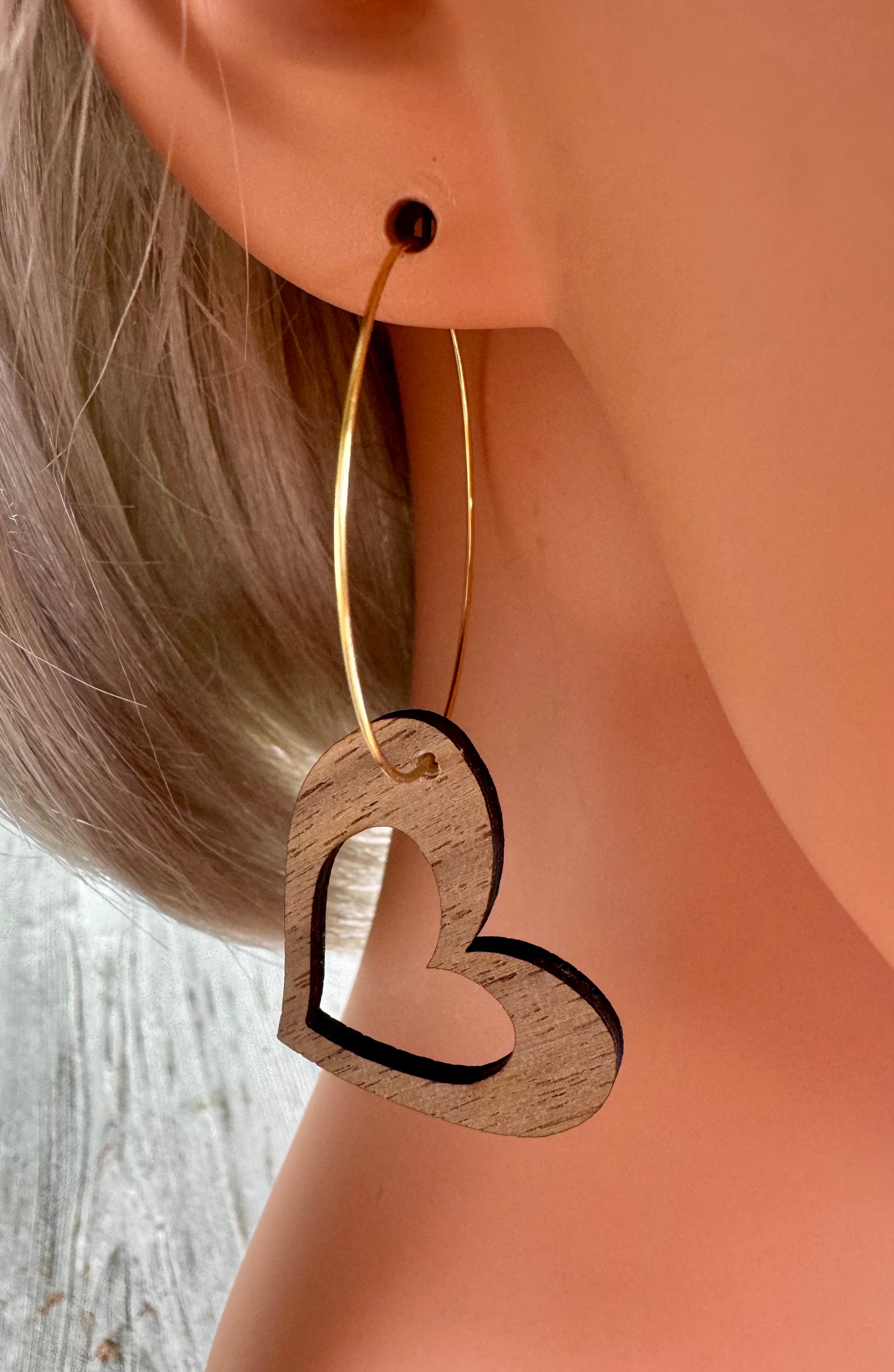 Ohrringe mit einem Herzen aus heimischem Nussholz. Die Hänger und der Ring sind aus vergoldetem Edelstahl. Das Design stellt absolute Natürlichkeit dar. Die Ohrhänger bieten federleichten Tragekomfort.